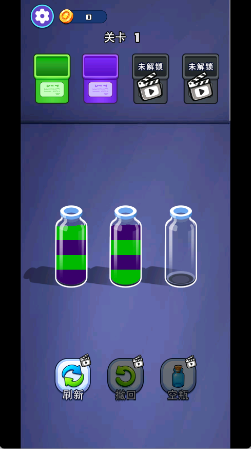 1、经典的倒水玩法。我们需要将同一个颜色的水倒入到一个瓶子中,注意最上面一层相同才能倒入。