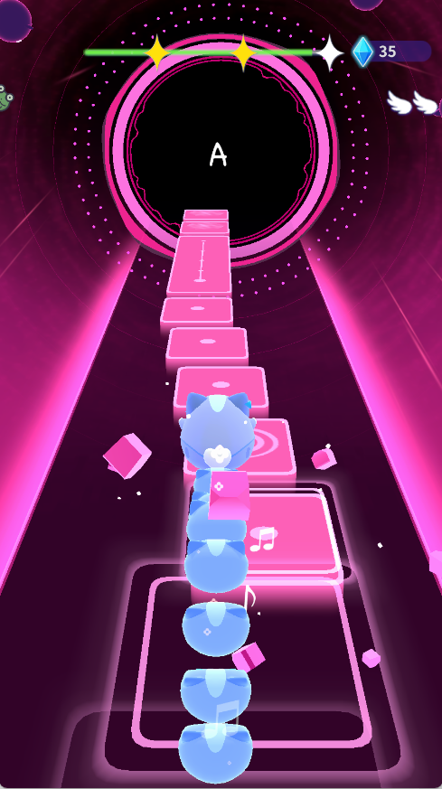2、操作方式为滑动操控小猫移动方向,需踩准音乐节拍,让小猫准确跳至下一个音乐方块。